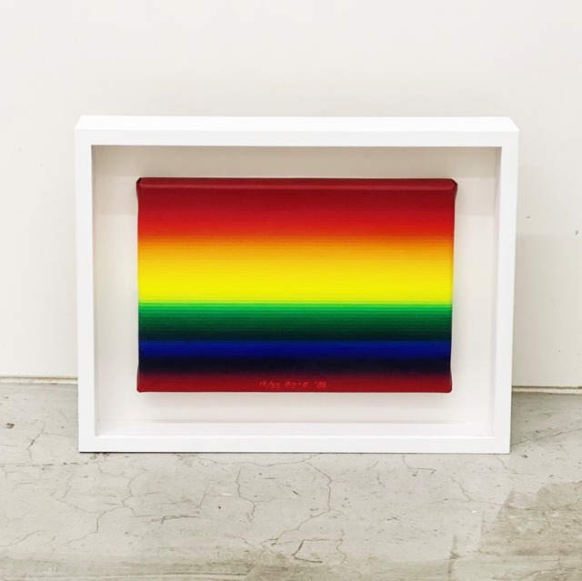 Artist : 靉嘔 Ay-O Title : 60 Gradation Rainbow Year : 1985 Size : 318 x 409 mm Edition : 35 (レゾネ No.546) Condition:良好 Medium : カンヴァスにシルクスクリーン Description:靉嘔は1000点以上の版画作品を制作していますが、その多くは紙に刷られたものです。本作のようにカンヴァスにシルクスクリーンで刷られた作品は比較的稀で、1985年以降では2004年と2017年に制作された例しか知られていません。 本作では、約5ミリ幅の色帯を60版・60色にわたって重ねることで、虹のスペクトラムのような色の移行を表現しています。一見すると滑らかなグラデーションのように見えますが、実際には微細な色層の積み重ねによって成り立っています。使用されているインクは油絵具で、乾きが遅く高価であるため、紙ではなくカンヴァスに60版を刷り重ねるには高度な技術が要求されます。まさに刷師とアーティストの共同制作によって生まれた作品です。 靉嘔は、人が色や形を認識できるのは光の存在によると考え、人間の目に見える光のスペクトラムを作品の構造に取り入れました。虹は一般的に象徴的なモチーフとして語られますが、靉嘔のレインボー作品は象徴性に基づくものではなく、光と視覚の原理を版画のプロセスで具体化したものです。